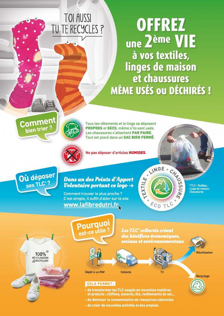Tous les textiles d'habillement, linges de maison et chaussures usagés peuvent être rapportés, quel que soit leur état, même abîmés. Ils doivent être placés propres et secs dans un sac et les chaussures liées par paires. Les textiles sont les premiers déchets à avoir été récupérés pour être réutilisés.